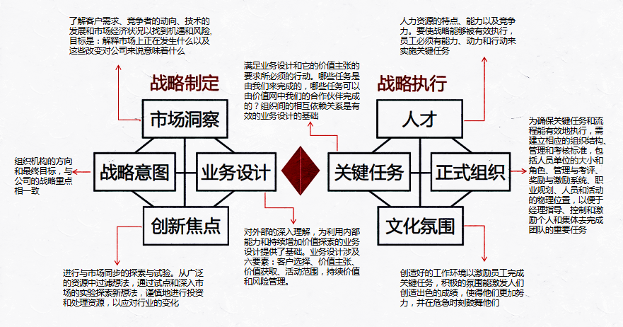 如下图,企业战略规划通常包含战略制定与战略执行两大部分,总共涵盖8个模块。战略解码聚焦业务设计与关键任务这两个模块。